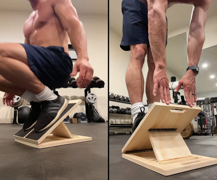 By slightly changing the angle — elevating your heels during a squat, or your toes during a calf raise — you shift the load away from your knees and toward the muscles that are supposed to handle it.